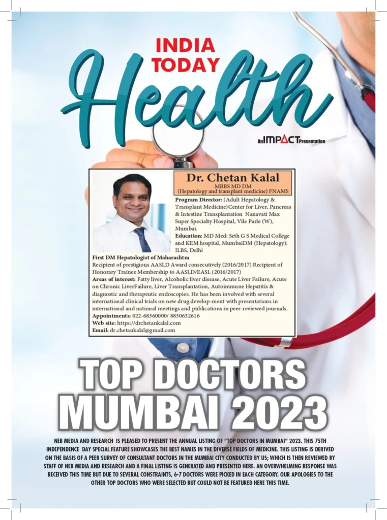 Dr. Chetan Kalal was recognized in India Today Health’s prestigious 2023 listing of Top Doctors in Mumbai, honoring his excellence and trusted expertise in hepatology and liver care.